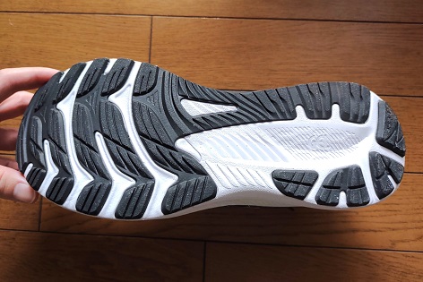 アウターソールのパターンは前モデルの28代目よりGT-2000 10に似ています。形状は28代目と同じフラットソールで接地から蹴り出しまで体重移動がスムーズです。また、体感的にもつま先部分が少し上に反っており踏みつけ部にも力が入りやすい走り心地です。