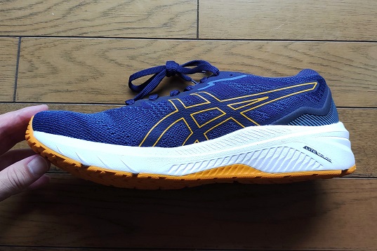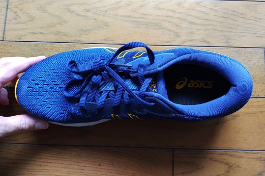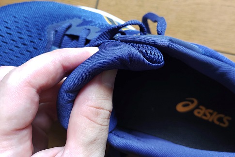 アッパーの生地はペラペラではなく適度に厚みがあり足あたりは柔らかく優しいフィット感です。サイドのアシックスストライプはガッチリとした補強の役割はないですが生地の必要なところは伸縮が少なく作られています。そのため中足部あたりのホールド性は弱くなく走行中に足もブレにくくなっています。
