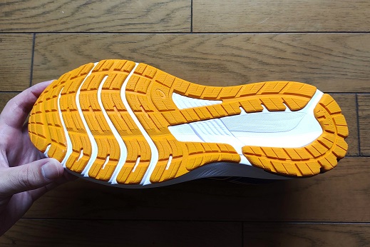 アウターソールを見ると10代目までのようなTRUSSTIC(トラスティック)という中足部のパーツもなくなっています。代わりにLITETRUSS(ライトトラス)が走行中のシューズのねじれを抑えて安定性を高める役割も担っているようです。形状はフラットソールで接地から蹴り出しまでスムーズです。