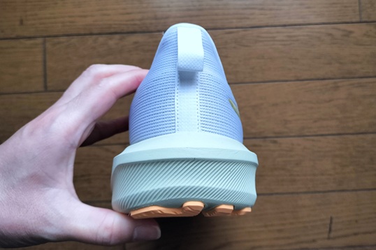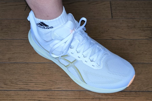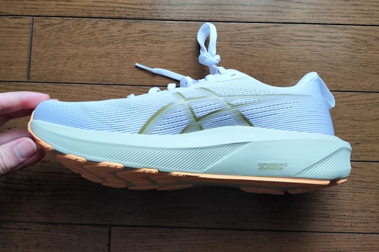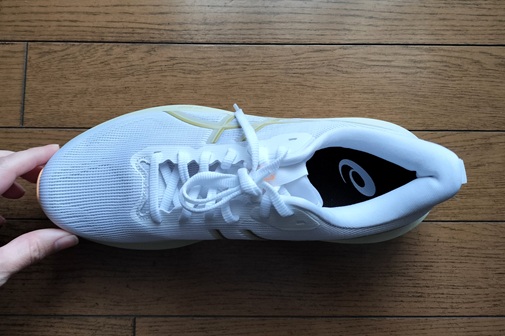 サイドの「アシックスストライプ」は、内側はプリントですが、外側にはやや硬さのある素材を採用。これがホールド感に強く影響するほどではないですが補強の役割を担っているようです。個人的には、内側にも同様の補強があればさらにサポート性が高まると感じましたが、このあたりは軽量化とのトレードオフかもしれません。