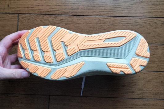 今作で特徴的なのは、近年のモデルでは影を潜めていたアウターソールの「溝」がしっかりと刻まれている点です。かつての「ガイダンスライン」を彷彿とさせるこの構造は、3Dガイダンスシステムと連動し、着地から蹴り出しまでの体重移動をより正確に、そしてスムーズに導いてくれる感覚があります。