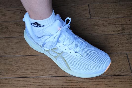 サイドの「アシックスストライプ」は、内側はプリントですが、外側にはやや硬さのある素材を採用。これがホールド感に強く影響するほどではないですが補強の役割を担っているようです。個人的には、内側にも同様の補強があればさらにサポート性が高まると感じましたが、このあたりは軽量化とのトレードオフかもしれません。