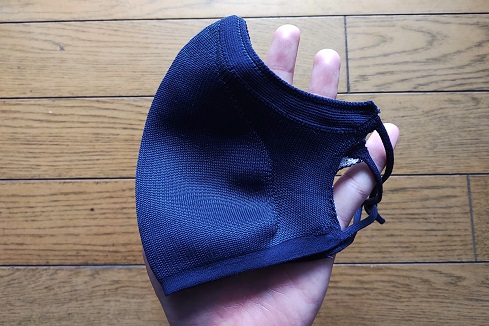 顔に着けてみると鼻の下と口のあたりの空間が広く呼吸がしやすいです。呼気はこもらず通気性も良いです。生地の厚みが大きいですが重さは気になりません。